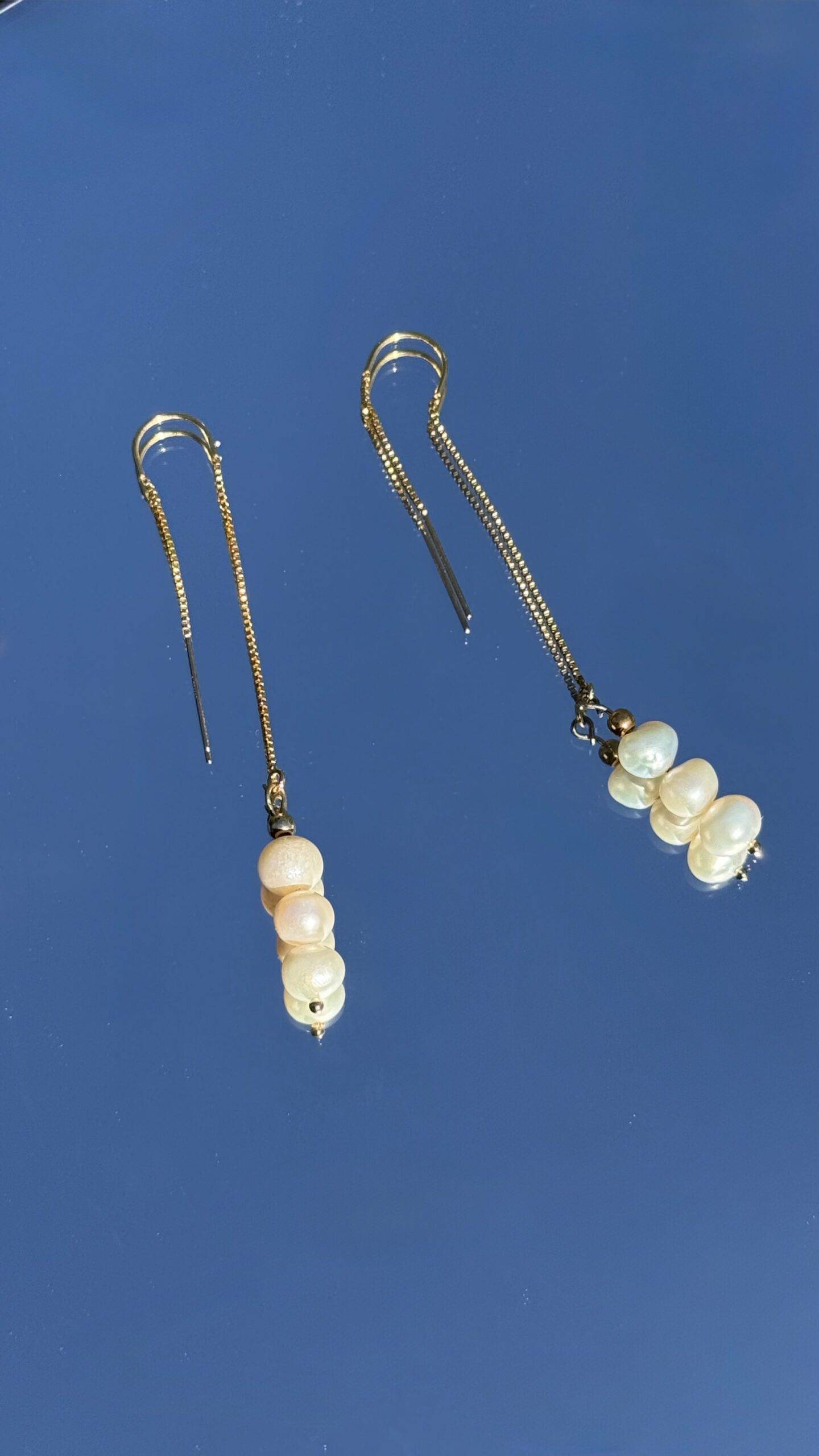 Boucles d'oreilles pendantes en gold filled, et perles d'eau douce en nacre blanche, perles dorée à l'or fin