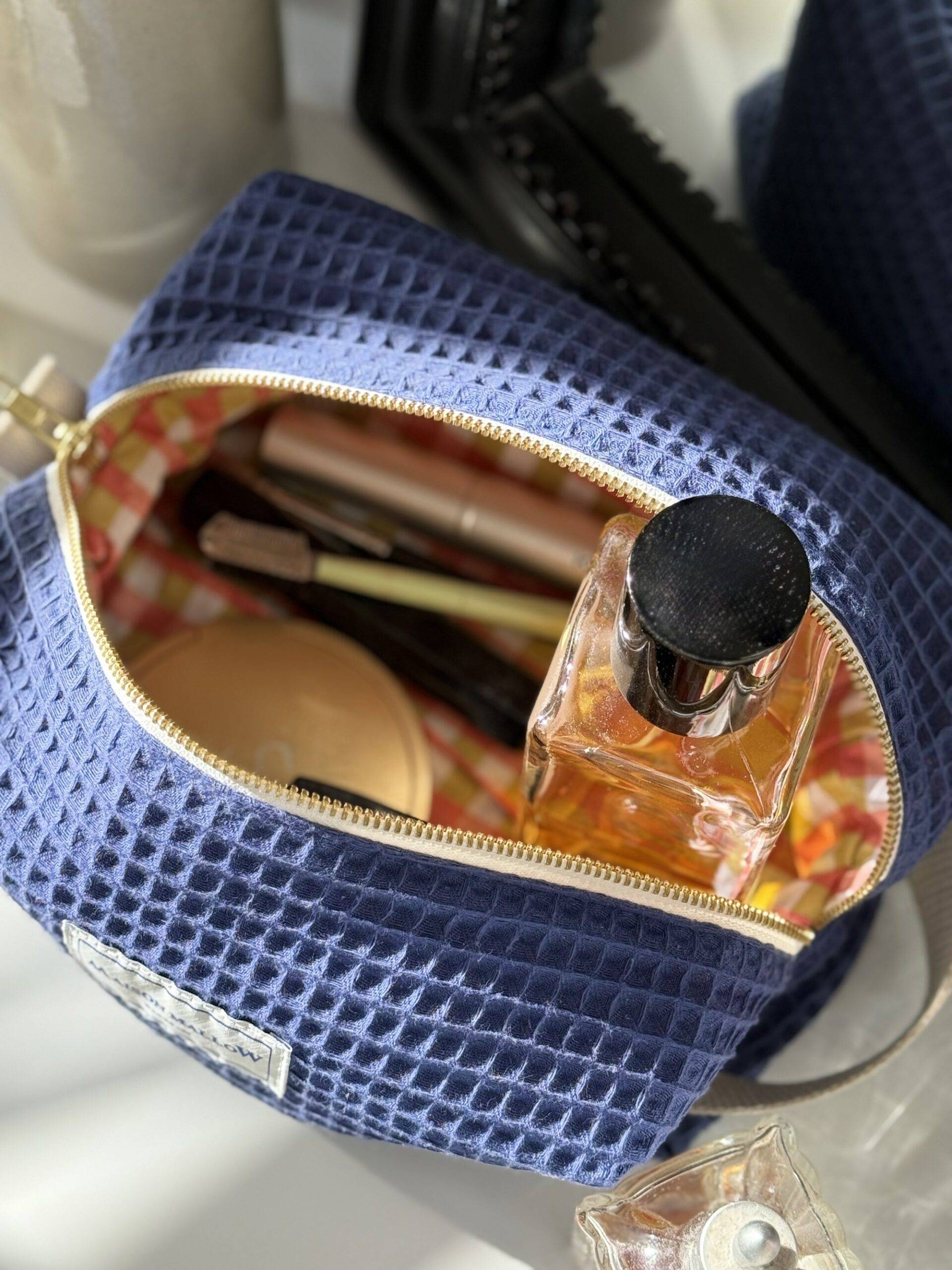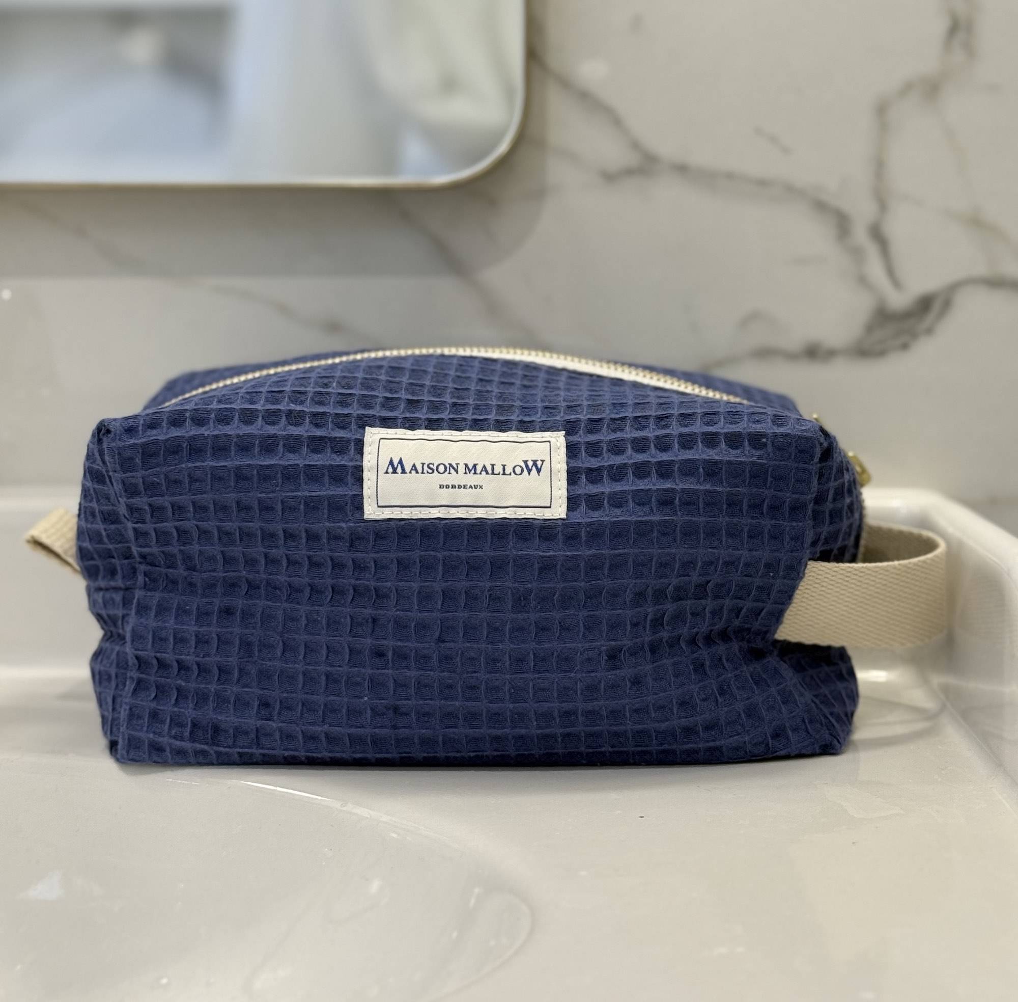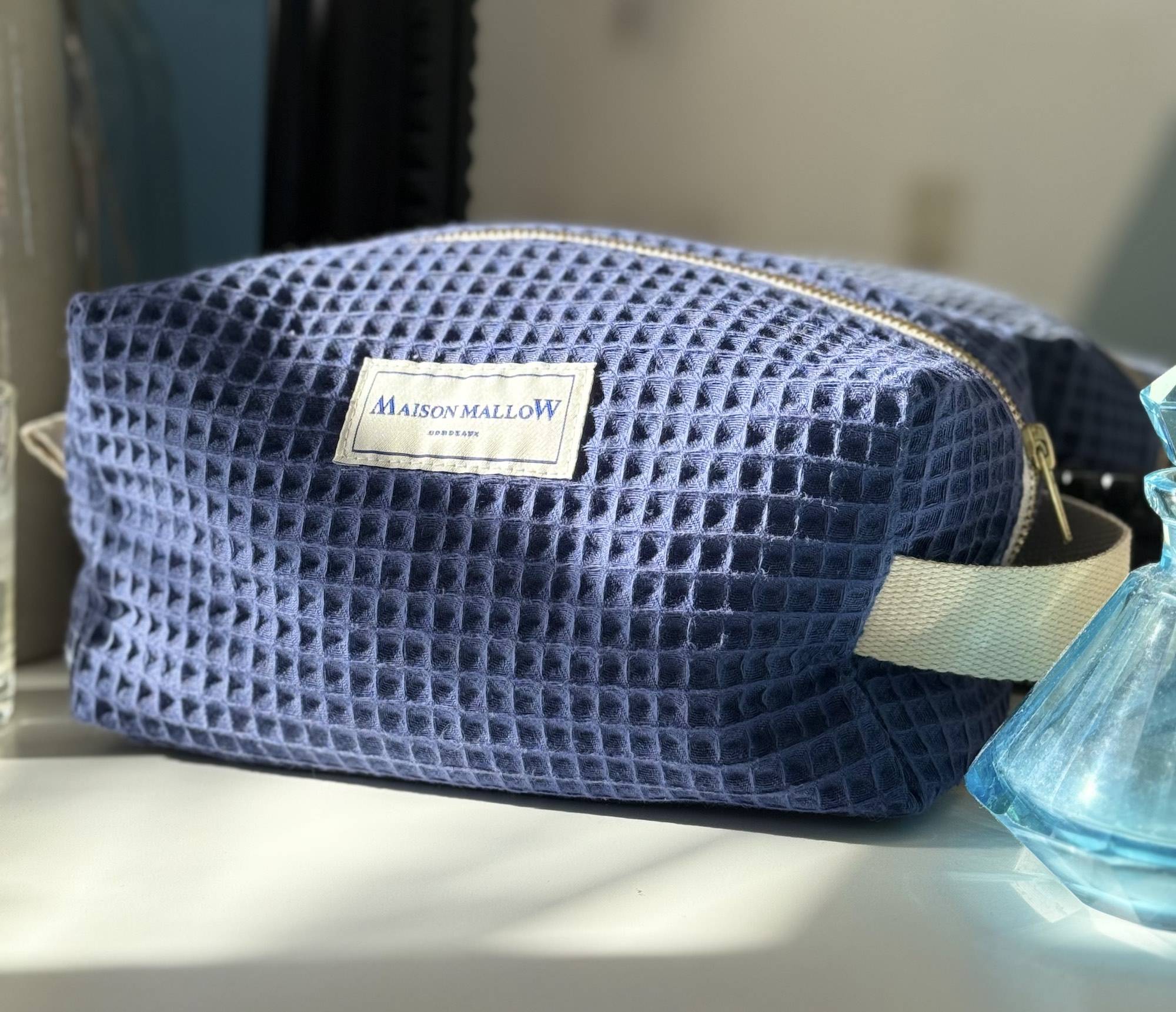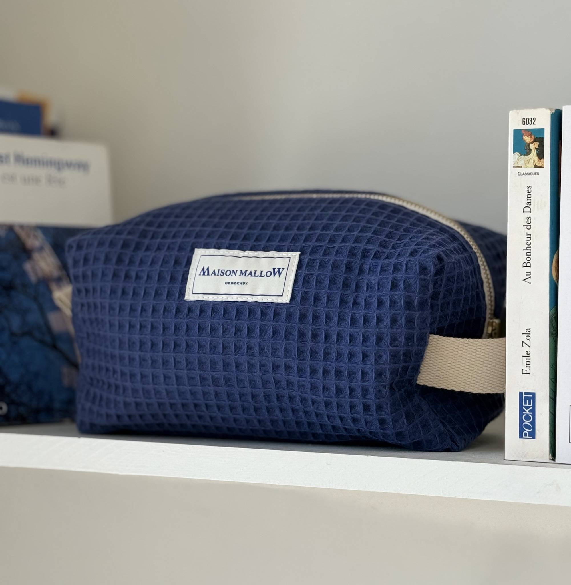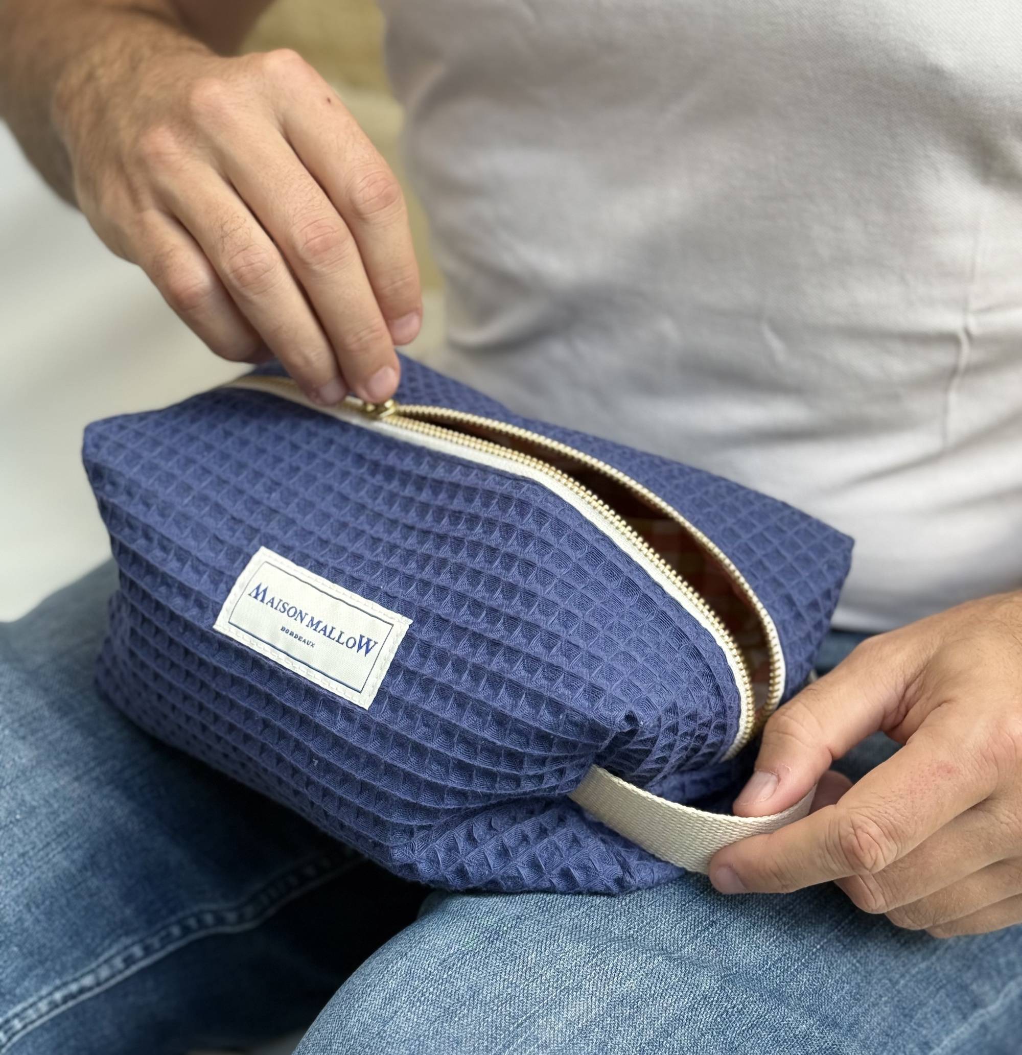 Découvrez l'élégance des trousses de toilette Maison Mallow, entièrement fabriquées à la main en France. Ce modèle bleu indigo aux accents pêche et moutarde allie esthétisme et fonctionnalité dans un savoir-faire artisanal français d'exception.